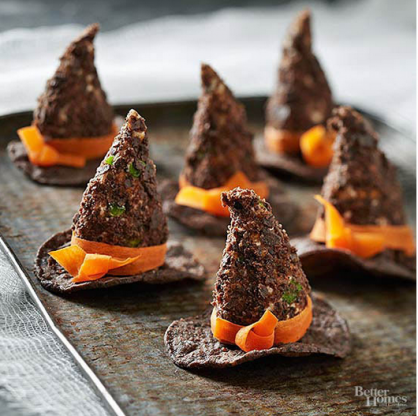 For a savory treat, combine cream cheese, shredded cheese and jalapenos to make a cheese dip. Roll in crushed blue corn torilla chips to form cones. Place on another chip to create witch hats in individual portion sizes.